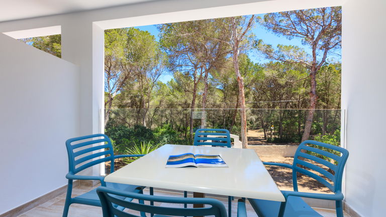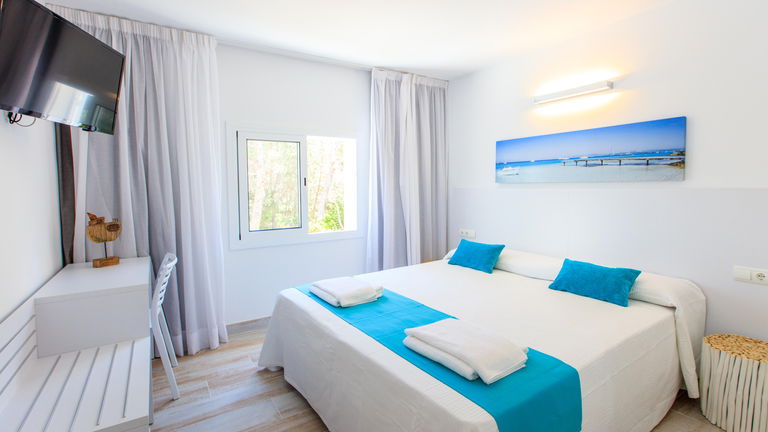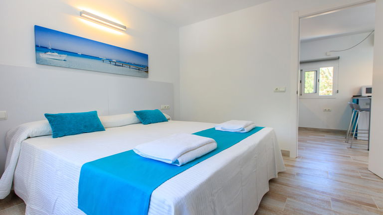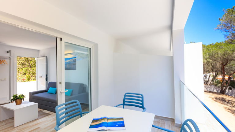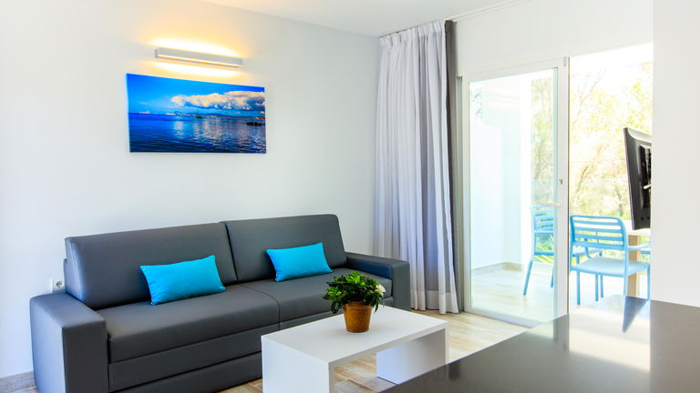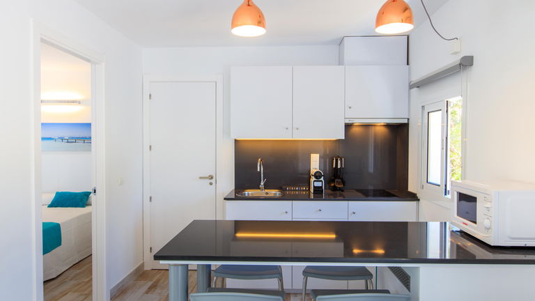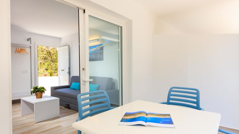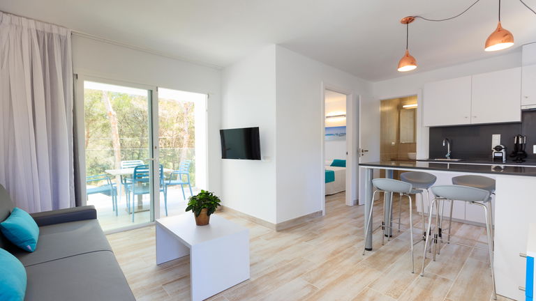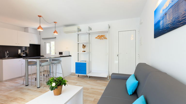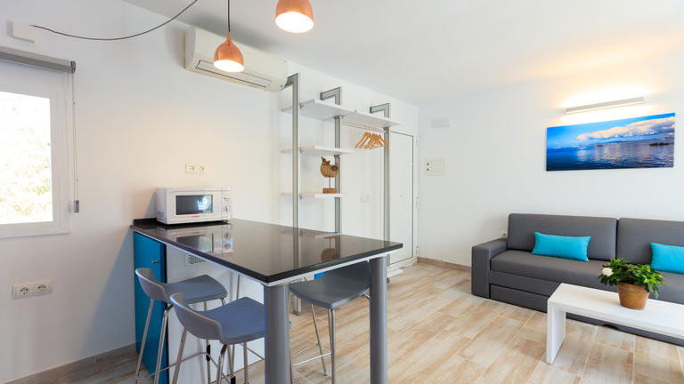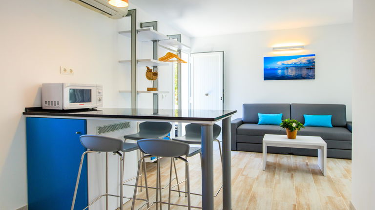 35m2 Apartment, recently renovated in 2017, with living room, bathroom, kitchen and double bedroom, sofa bed, American bar with stools and a terrace. Air conditioning in the living room and a television in both living room and bedroom. There are 2 types on request and according to availability, the ground floor ones, in front of the natural gardens and the first floor ones that have a balcony.