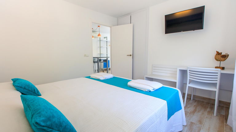 The high-end apartments are specially recommended for families and couples, taking into account the privacy you can enjoy and their pleasant atmosphere with plenty of natural light. In addition to their facilities, with a fully equipped kitchen, double glazing, air conditioning in the bedroom and Wi-Fi. They have 2 single beds put together like a king-size bed in the bedroom and a sofa bed ready in the living room (150 cm by 200 cm).